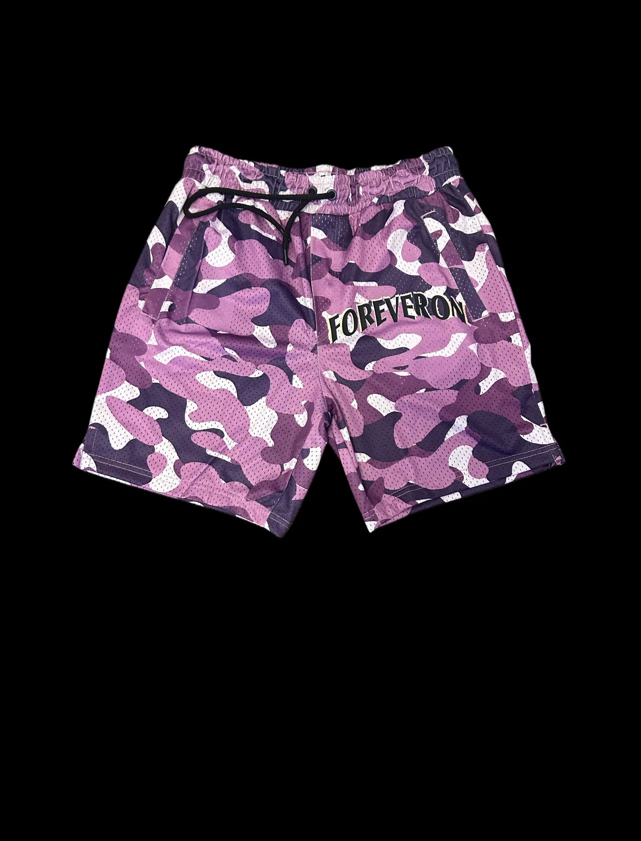 The unique purple camo pattern adds a fresh, bold twist to classic athletic wear, ensuring you catch eyes wherever you go. "FOREVER ON" is prominently displayed on the leg in contrasting black, serving as a constant reminder of your unwavering dedication. Crafted from a breathable, lightweight mesh fabric, these shorts provide optimal comfort and freedom of movement, keeping you cool and focused during any activity.
