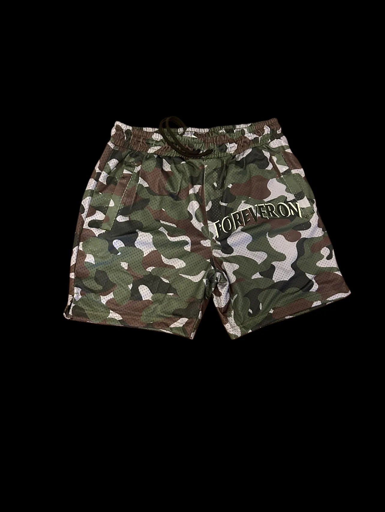 The timeless green camo pattern provides a rugged yet stylish look, ensuring you blend in where you want to, and stand out when it counts. "FOREVER ON" is boldly displayed on the leg in a contrasting darker tone, serving as a powerful reminder of your continuous drive. Crafted from a breathable, lightweight mesh fabric, these shorts deliver optimal comfort and unrestricted movement, keeping you cool and focused no matter the intensity.