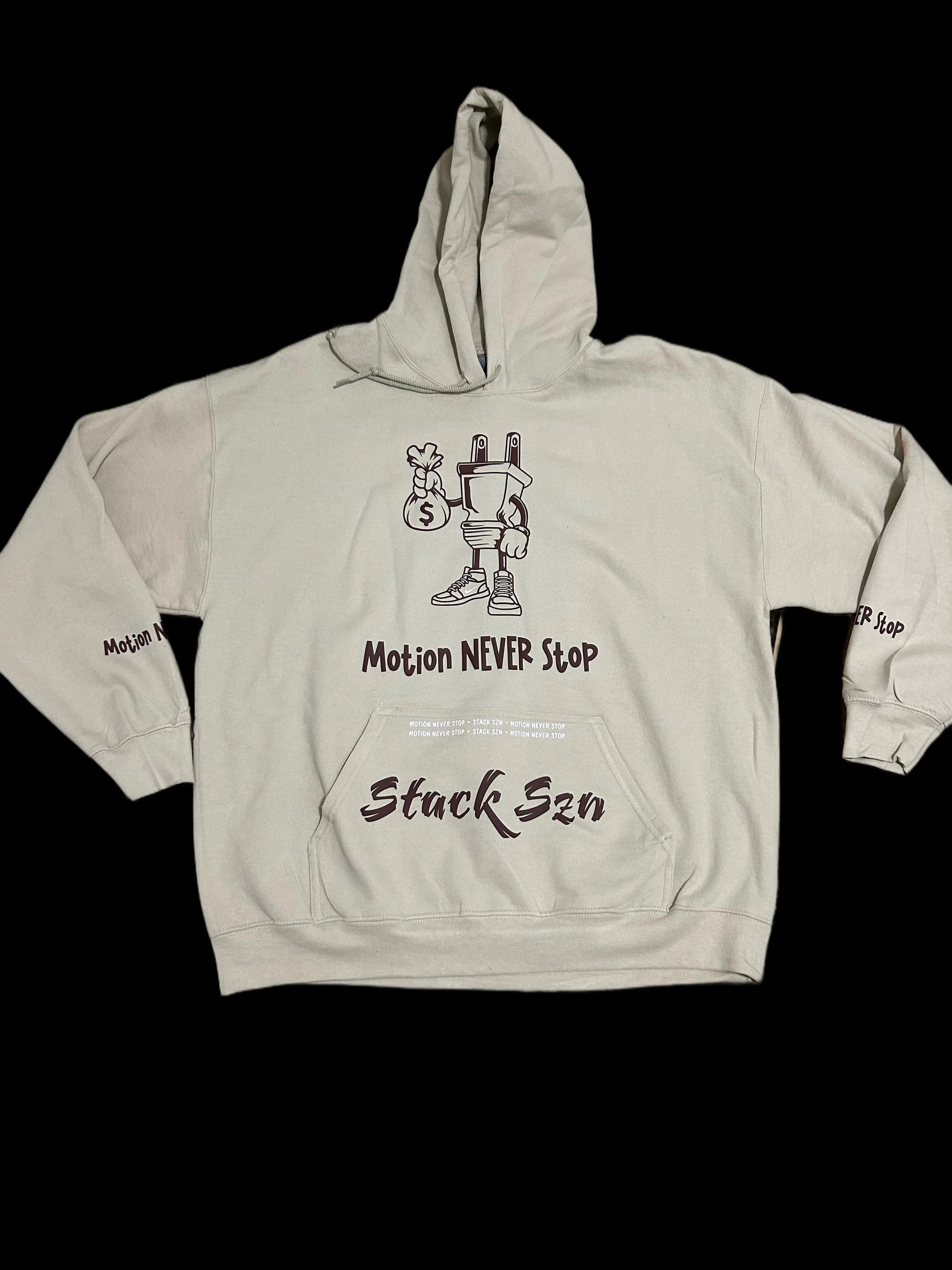 Description: Embrace the continuous drive with our "Motion Never Stop" Stack SZN Hoodie in a sophisticated Earth Tone, featuring striking dark graphics. This hoodie is designed for those who navigate their path with unwavering determination and a refined sense of style. The central design showcases a dynamic character holding a money bag, symbolizing the ongoing pursuit of success, boldly stating "Motion Never Stop."