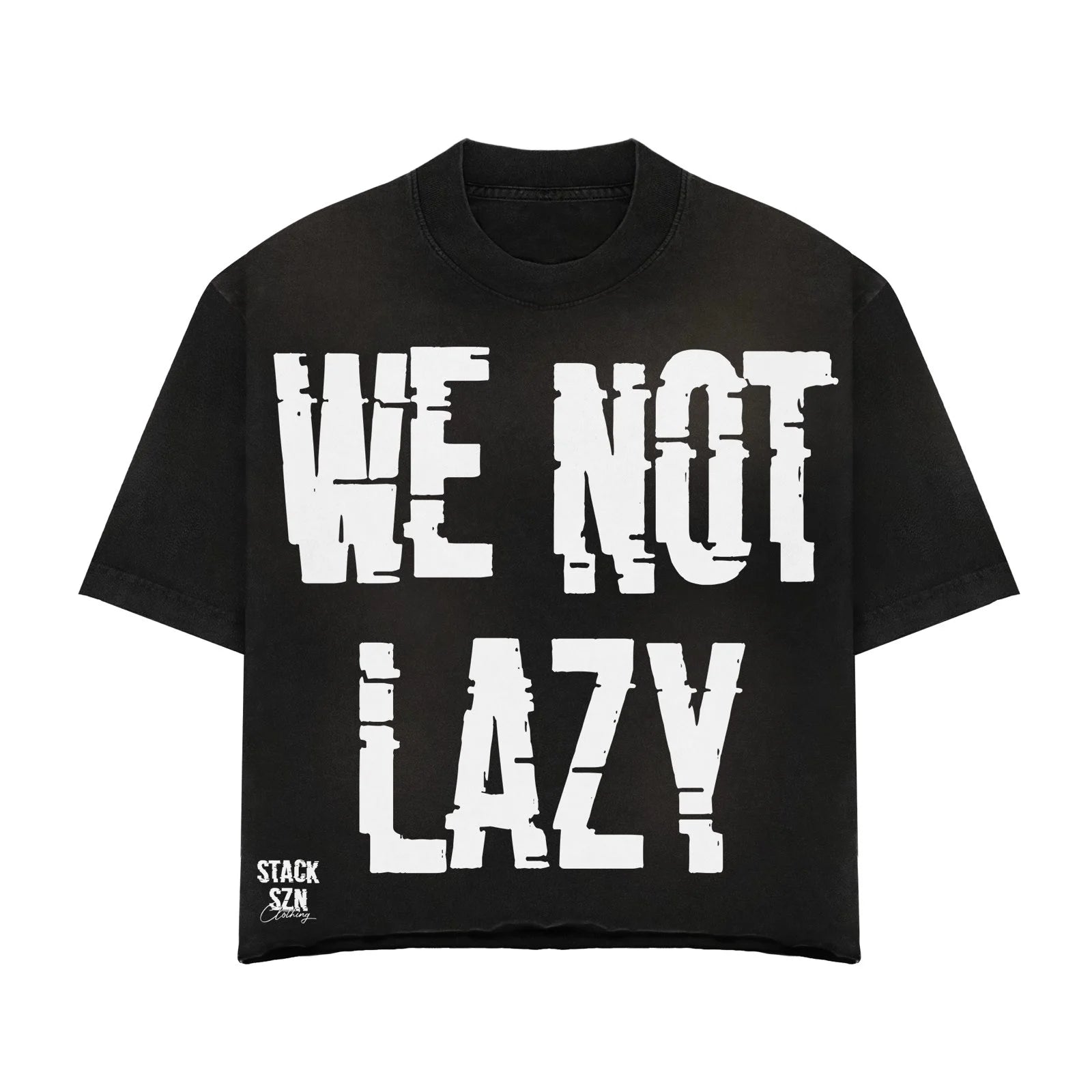 Declare your drive with our STACKSZN "WE NOT LAZY" black graphic tee, a bold statement piece for those who embody hustle and ambition.