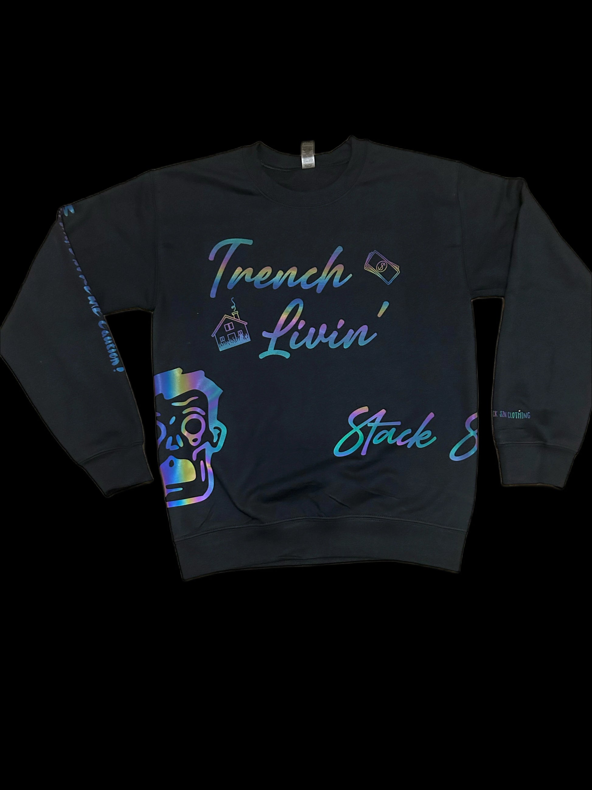 Illuminate your style with the "Trench Livin'" Stack SZN Iridescent Reflective Crewneck. This unique crewneck takes the iconic "Trench Livin'" design to the next level with a captivating multi-color reflective print that shimmers with a rainbow of hues when caught by light. Featuring the distinctive house and money bag icons, a stylized character on the side, and bold "Stack SZN" lettering, this piece is designed to make a statement both day and night.