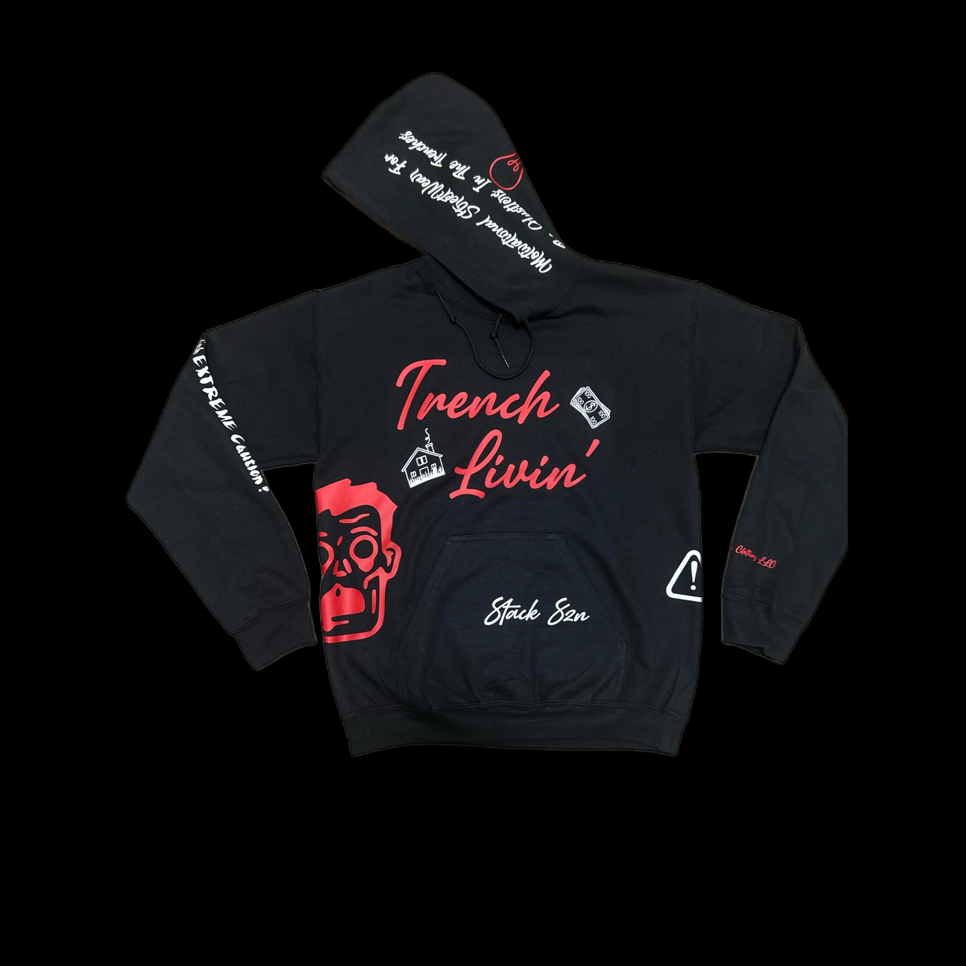 Make a powerful statement with the "Trench Livin'" Stack SZN Hoodie, featuring striking red graphics on a classic black base. This hoodie is designed for those who navigate the grind with passion and determination, turning challenges into triumphs. The front boldly showcases "Trench Livin'" in a vibrant red script, accompanied by the iconic house and money bag symbols, and a distinctive stylized face graphic on the side, all pulsating with energy. "Stack Szn" reinforces the core message of relentless growth and ambition.